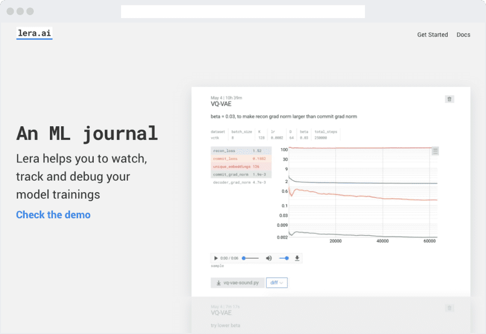 Lera.ai is a webapp for an ml engineer or a scientist to watch a model training in real-time. Compare performance for different hyperparameters. It requires almost no setup efforts.