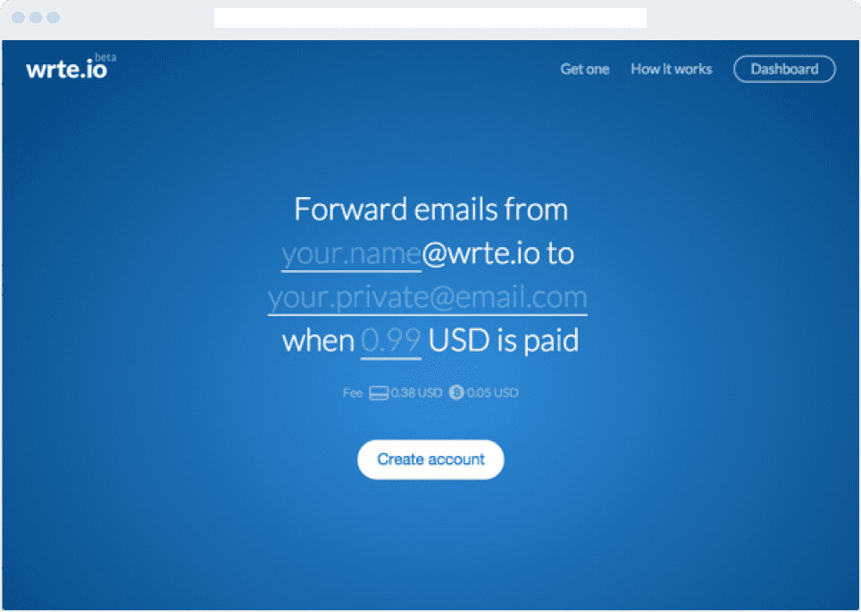 wrte.io is an email paywall. You can have an email address and put it on a web page. Email messages to this address are not delivered until sender pays a certain amount of money. It can be used to protect yourself from spammers, recruiters, earn some bitcoins or use your fame for charity. Currently, the project is closed.